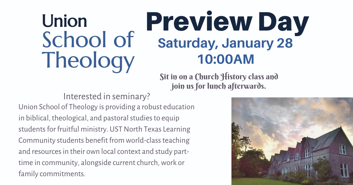 Union School of Theology’s North Texas Learning Center provides trustworthy, affordable, pastoral, and accredited seminary education. Our program is ideal for busy professionals and parents who desire to go deeper in their walks with the Lord and be equipped for vocational ministry. Come meet Justin Schell the Director of UST’s Learning Centers and learn more about our program.