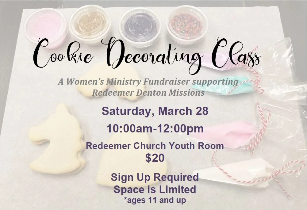 Have you wanted to learn how to decorate those precious seasonal sugar cookies? Margaret Grauke of Glory Bakes will be teaching a class on Saturday, March 28th. A portion of the proceeds gathered from this class will support our Summer Missions Team. Space is limited and sign ups will close when we have reached capacity.