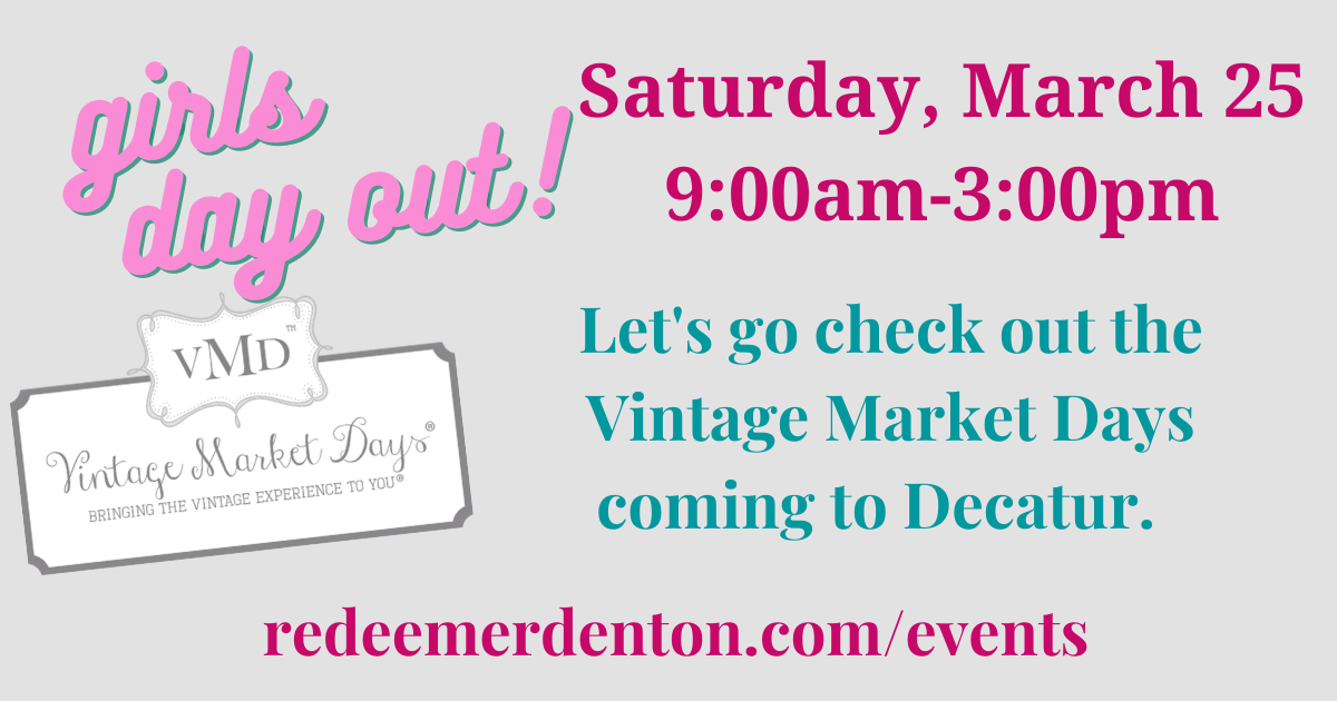 We will meet at Redeemer at 9:00am and caravan out to Vintage Market Days in Decatur. Vintage Market Days is an upscale vintage-inspired market featuring original art, antiques, clothing, jewelry, handmade treasures, home décor, outdoor furnishings consumable yummies, seasonal plantings and more. We will hit the road by 9:15am, shop, eat lunch, and head out at 2:00 and be back at Redeemer by 3:00pm. Bring money for lunch and goodies!