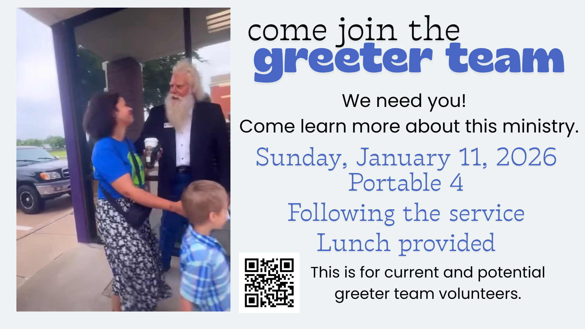 As we grow, we need to welcome more new faces each Sunday. Will you prayerfully consider joining the greeter team? Following the service on January 11th, we will be having an informational meeting for current and potential volunteers. This is a great time to jump on board this team. Lunch is provided.